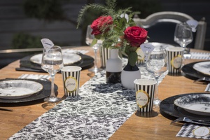 Na slavnostní stolování použijte tento černý ubrus Versailles s ornamenty o rozměrech šířka 28 cm, délka 5 metrů.