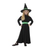 Dětský holčičí kostým čarodějnice uličnice tvoří dlouhé černé šaty se zeleným páskem a černý klobouk se zelenou stuhou.