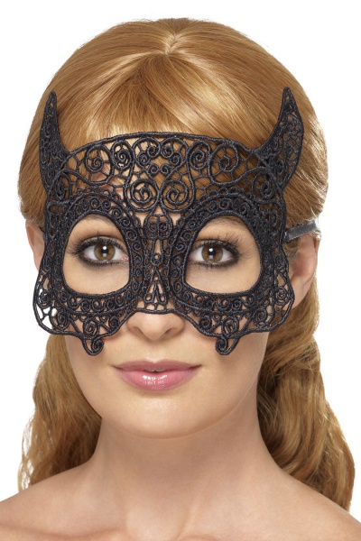 Černá filigránová maska-škraboška na oči Devil, vhodná na Halloween či benátskou noc.