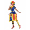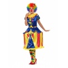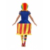 Dámský kostým kolotočové klaunice deluxe, který tvoří pestrobarevné šaty vyztužené svítící obručí, čelenka do vlasů a skládaný klaunský žlutý límec.