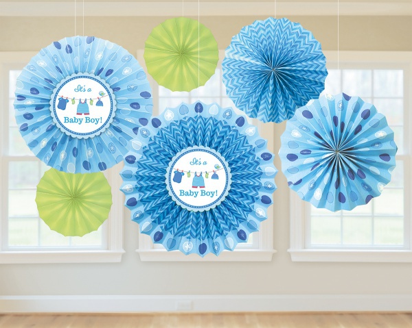 Sada šesti papírových rozet Boy v modrém provedení. O průměru 21 / 30 / 40 cm. Vhodná výzdoba k přivítání nového člena do rodiny.